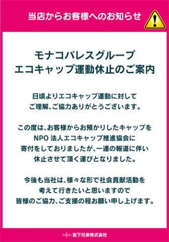 日頃より、エコキャップ活動に対して、ご理解ご協力賜り誠にありがとうございます。 お客様からお預かりしたキャップをNPO法人エコキャップ推進協会へ寄付を続けてまいりましたが、この度、一連の報道により休止させていただくことにいたしました。 また、活動再開時には、改めてご報告いたしますのでご理解方お願い申し上げます。