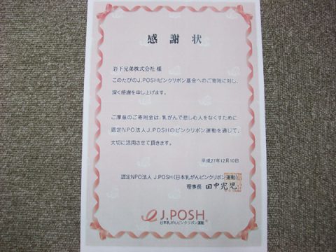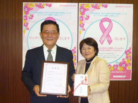 弊社は12月25日、モナコパレス神宮本店(宮崎市)で認定NPO法人J.POSHに対し、 お客様からの寄付金及び自販機売上の一部を贈呈し、同理事の平田以津子氏より感謝状を拝受しました。 今回の寄付金は、乳ガンで悲しむ人を減らすための活動資金として運用されます。